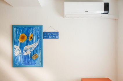 Units include air conditioning, a seating area, and a CD player. There is also a kitchen, fitted with a fridge and stovetop.