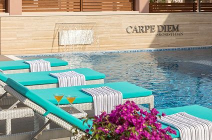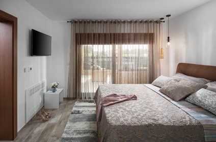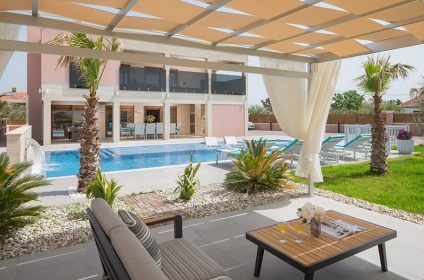 Near the pool there is a gazebo with garden furniture, and it is completely surrounded by a spacious garden with palm trees. The rest of the outdoor space is furnished in a modern style, designed for relaxation and unwinding. When the sun is not in sight, on the second floor guests can find a wellness room with jacuzzi, sauna and flat-screen TV for complete relaxation. The wellness room has access to an open roof terrace with sun loungers, parasols and an outdoor shower.
