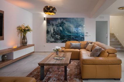 This villa offers optimal accommodation for 8 people, but can accommodate 2 extra people on the sofa in the living room. The ground floor consists of a modern kitchen equipped with everything guests need during their stay in the villa, a dining room for 10 people and a comfortable living room overlooking the main terrace and pool. Furthermore, large glass surfaces extend throughout the villa to provide as much natural light as possible.