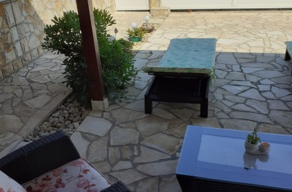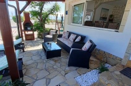Apartman je klimatiziran i sastoji se od dvije spavaće sobe sa velikim bračnim krevetom (u svakoj sobi je klima i tv) kuhinje, wc-a sa tuš kabinom i velikom terasom otvoreno-zatvorenog tipa sa kutnom garniturom na razvlačenje. Veliki parking je osiguran odmah uz apartman, a budući je dvorište ograđeno, idealno je za sigurnost djece kao i Vašeg kućnog ljubimca. U dvorištu se nalazi vanjski tuš, trampolina, ljuljačka i roštilj koji je na raspolaganju gostima.
